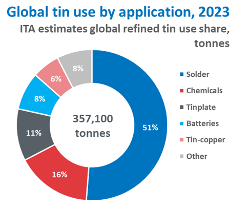 این فلز با ظاهری درخشان، نقطه ذوب مطلوب (۲۲۳ درجه)، قابلیت لحیمپذیری، غیر مضر برای انسان، بهعنوان یک پوشش محافظ در برابر خوردگی، و مناسب در کاربردهای مرتبط با مواد غذایی، جایگاه ویژهای در تولید ورق قلع اندود دارد به نحوی که طبق آمار انجمن جهانی قلع و مطابق با شکل ۲ بیش از ده درصد از مجموع ۳۵۷ هزار تن قلع تولید شده در جهان در سال ۲۰۲۳ در تولید ورق قلع اندود مورد استفاده قرار گرفته است.