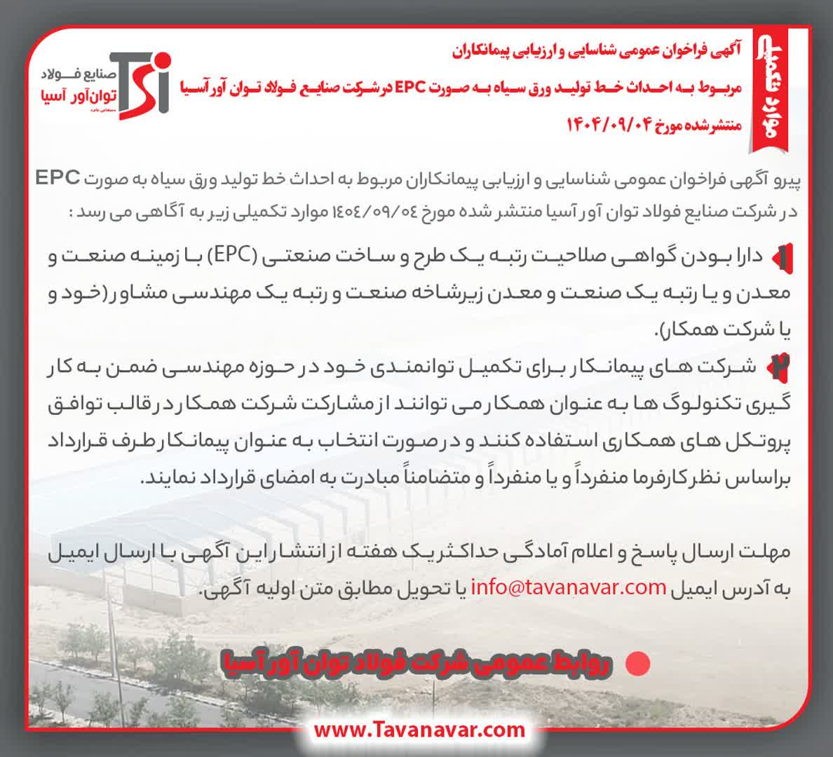 پیرو آگهی فراخوان عمومی شناسایی و ارزیابی پیمانکاران مربوط به احداث خط تولید ورق سیاه به صورت EPC در شرکت صنایع فولاد توان آور آسیا منتشر شده مورخ ۱۴۰۴/۰۹/۰۴ موارد تکمیلی زیر به آگاهی می رسد: